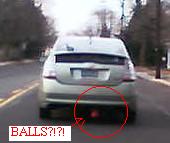 Since we are goofing on Prius owners, I saw this car this morning and snapped this terrible pic with my cell. Hanging from the back of the car were pink balls (not flesh colored - pink). Those same dumb things rednecks hang from the back of their pickup trucks. But these were pink & the car had handicap plates & was doing 5 under the speed limit. WTF?