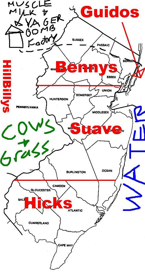 And then there is South jersey, where everything is spread out, there is no indoor plumbing, people drive without rear brakes, roads are not paved, or you are in the military.