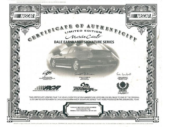 ok so we bought my dads 02 monte intimidator ss used and none of the documents were with the car, the one with the cars serial number out of the 3,333 made in 02 and so on, i found the attached one from a car on ebay. any idea how to get a new one if its possible, or even how to find the original owner? it came from preakness chevrolet new i think