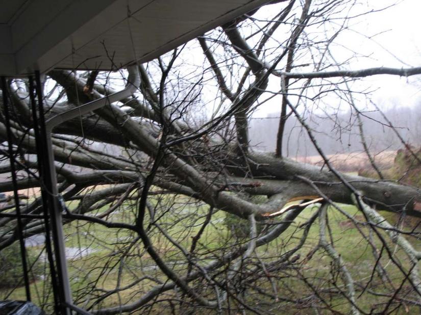 there are a bunch of trees down in town here, and a pretty good sized one on a house.