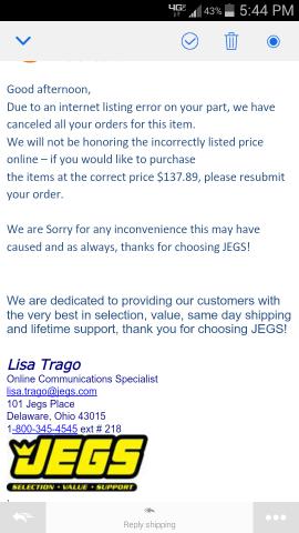 Go to jegs site and check tour order number. What does it say?