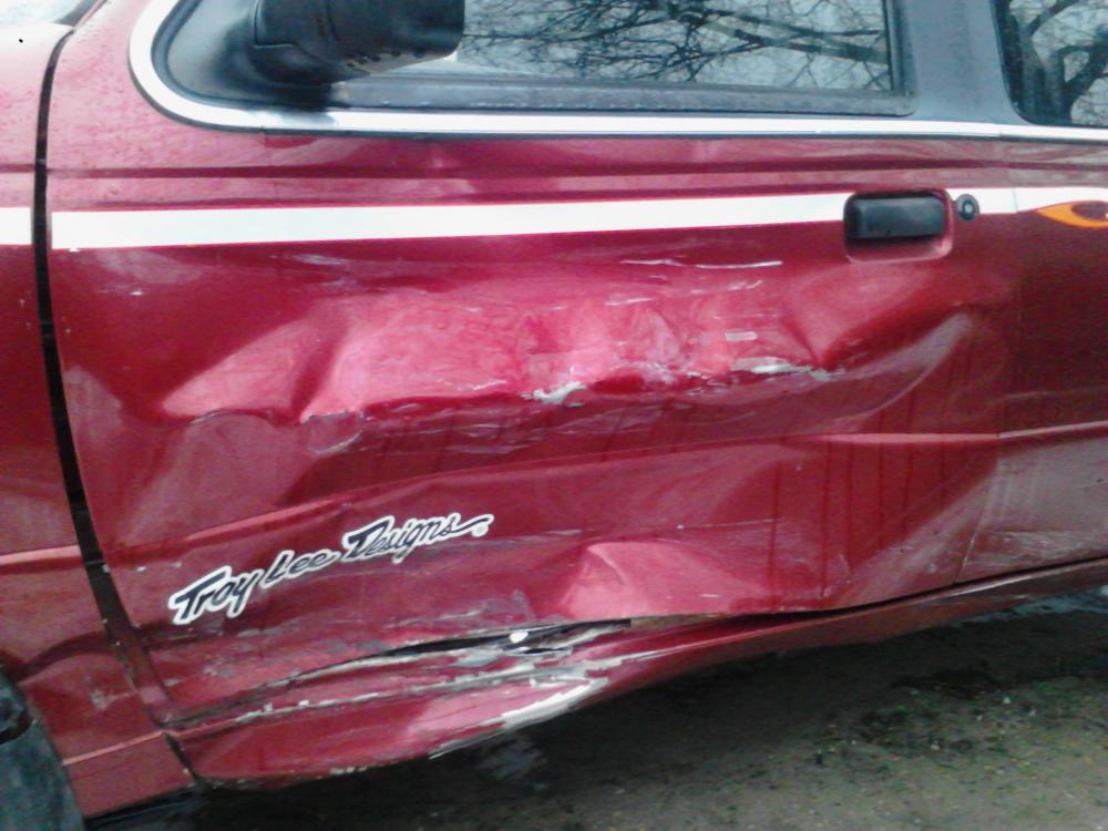 some lady ran a stop sign never even attempted to stop and now the truck is hurt. it will be rebuilt come hell or high water. right now we are hoping her insurance company will pay to fix it but it looks more likely that they will want to total it and we will have to do the work our selves. but as you can see from the picture if it wasn't for that crash bar in the doors things could have been alot worse.