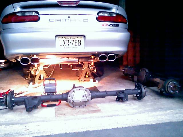 I discovered last night (at about 2am) that swapping rears used to be easier on a lift... If anyone's in the area of Midland Park NJ after work on Wendsday and would like to help me balance this boat anchor on my floor jack while I try to fanagle the springs in I could use about 30min of your time. My brother and Father are both away racing this whole week at some IHRA event in Michigan so Im screwed unless I can get Sach or maybe even recruit one of my non-mechanically inclined buddys to swing by... let me know.